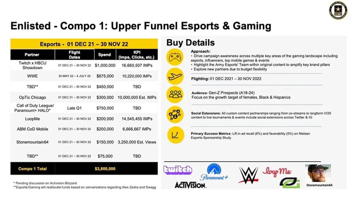 Серед іншого згадується й про партнерство з такими компаніями як Twitch, HBCU Showdown, WWE та LoopMe. Загалом витрати міноборони США мали скласти 3.8 мільйона доларів.