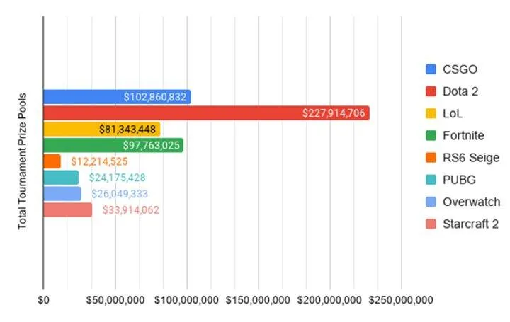 За сумарним призовим фондом за всі роки лідирує відеогра Dota 2, загальна сума призових склала майже 218 мільйонів доларів. На другому місці знаходиться Counter-Strike: Global Offensive з сумою у 102 мільйони доларів, а на третю сходинку потрапила відеогра Fortnite – 98 мільйонів доларів. Хоча цей проєкт від Epic Games вийшов лише у 2017 році, але вже нав'язує боротьбу гігантам цієї індустрії.