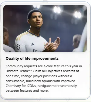 Запити спільноти є основою цього року в Ultimate Team: забирайте усі нагороди за виконання завдань одночасно, змінюйте позиції гравців без витратних матеріалів, створюйте нові склади з покращеною хімією для карток ікон, плавніше переходьте між екранами меню тощо.