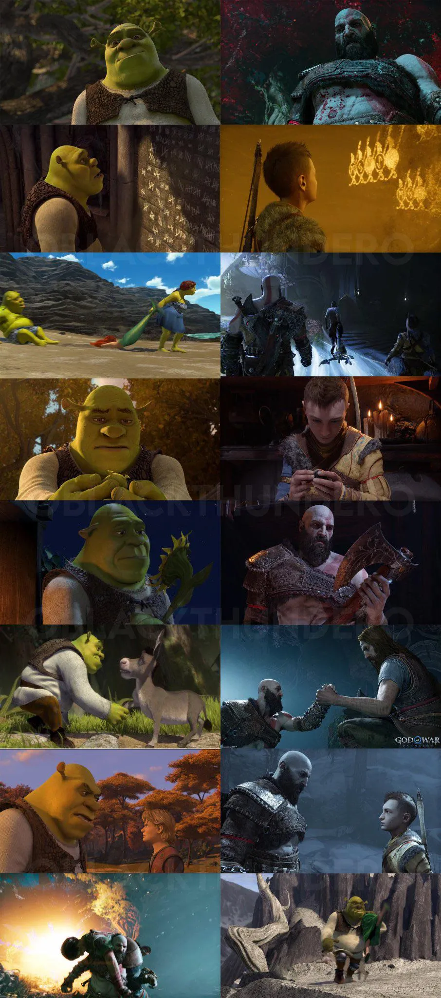 На усіх 8 порівняльних зображеннях Кратоса та Шрека можна побачити в майже ідентичних позах. Спершу обидва багатозначно дивляться вниз, потім подібно до того, як Шрек дивиться на квітку, що псується, Кратос дивиться на свою вірну сокиру Левіафана і далі в тому ж дусі.
