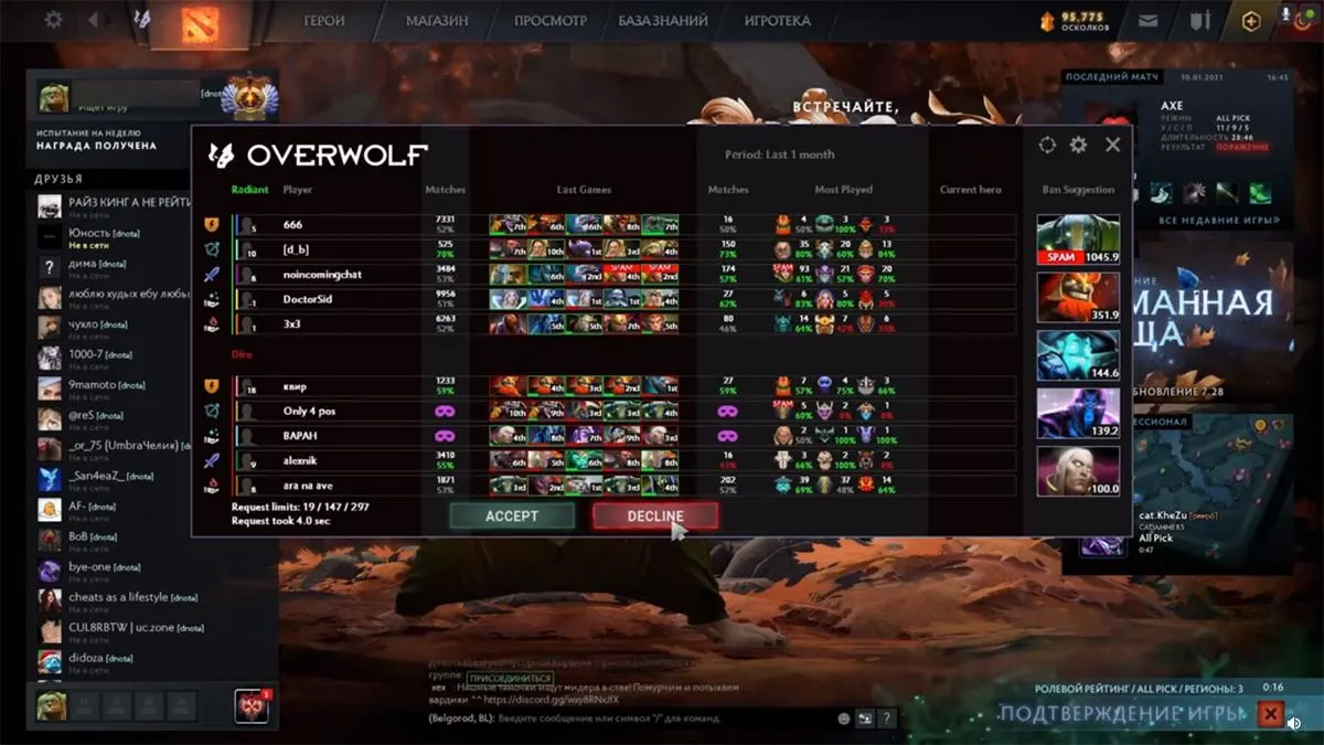 Чітерський додаток також дозволяє дізнатися всю інформацію про гравців свого та ворожого колективу. Але найцікавіше, що це можна зробити ще до натискання кнопки "Прийняти". Тобто чітер розпочинає пошук матчу, а також запускає свій нелегальний додаток. Коли гра знаходиться, то він отримує всю корисну інформацію, щоправда, щоб прийняти рішення у чітера є менш як 15 секунд.
