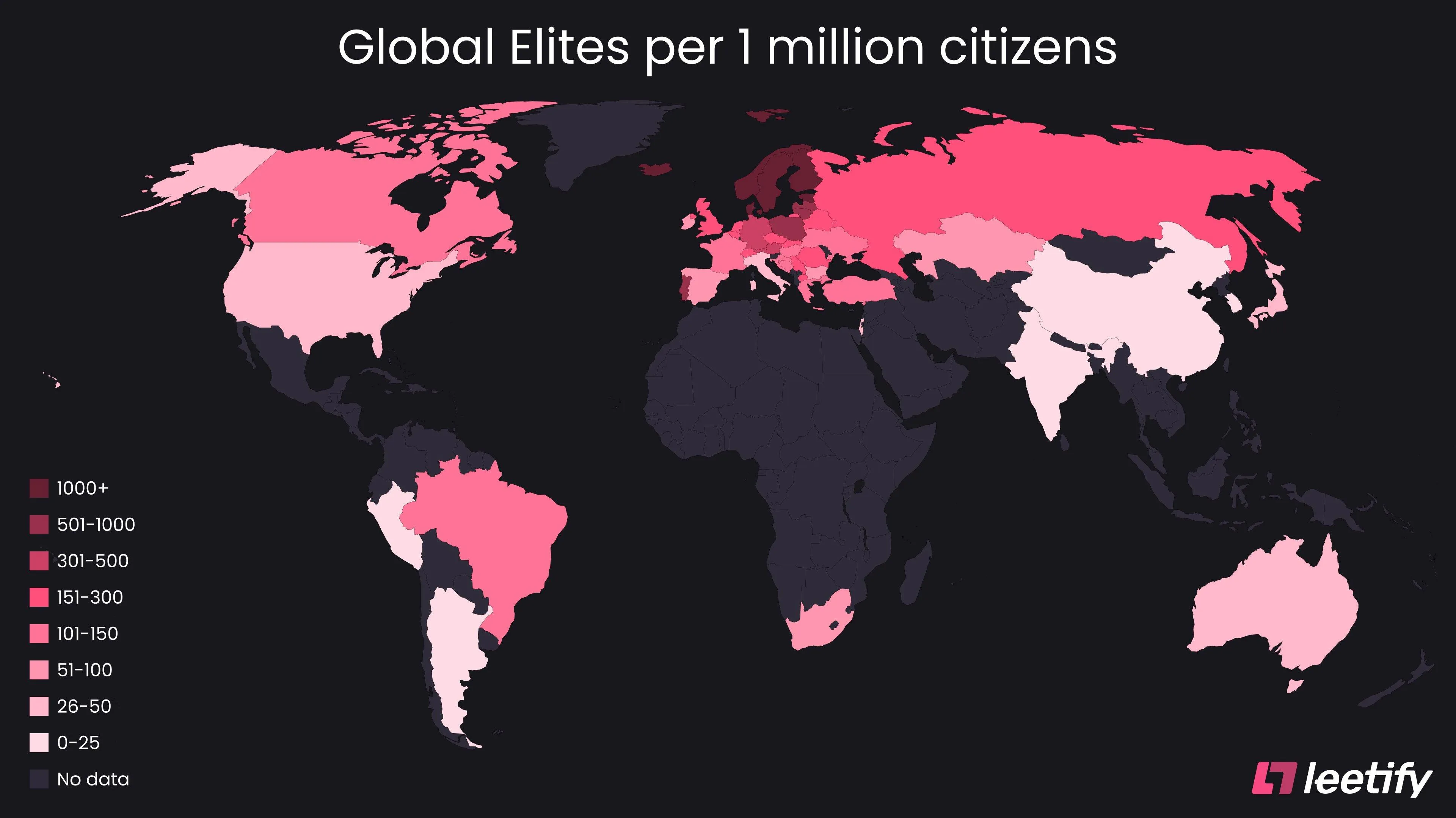 Кількість гравців зі званням Global Elite на мільйон населення у світі / Фото твітер Leetify