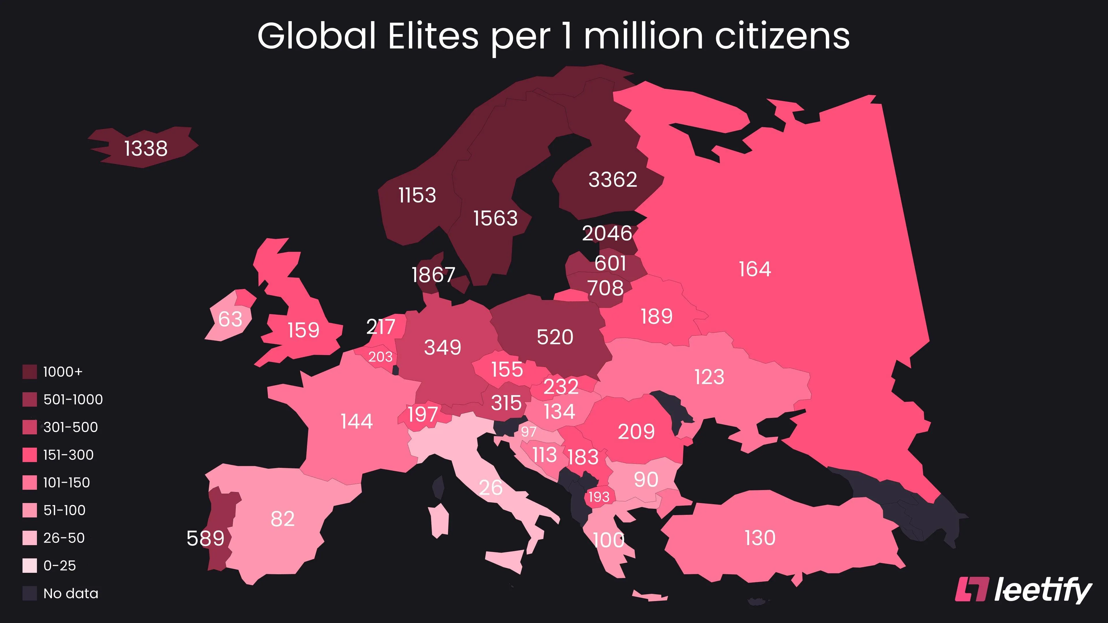 Найкращими виявилися скандинави та інші представники країн Північної та Центральної Європи. Найбільша кількість гравців зі званням Global Elite у Фінляндії – понад 3 тисячі на мільйон населення. Хоча представників цієї країни особливо успішними у професійному кіберспорті важко назвати. Звісно, всі можуть згадати команду ENCE, хоча назвати цей колектив стабільним не можна.