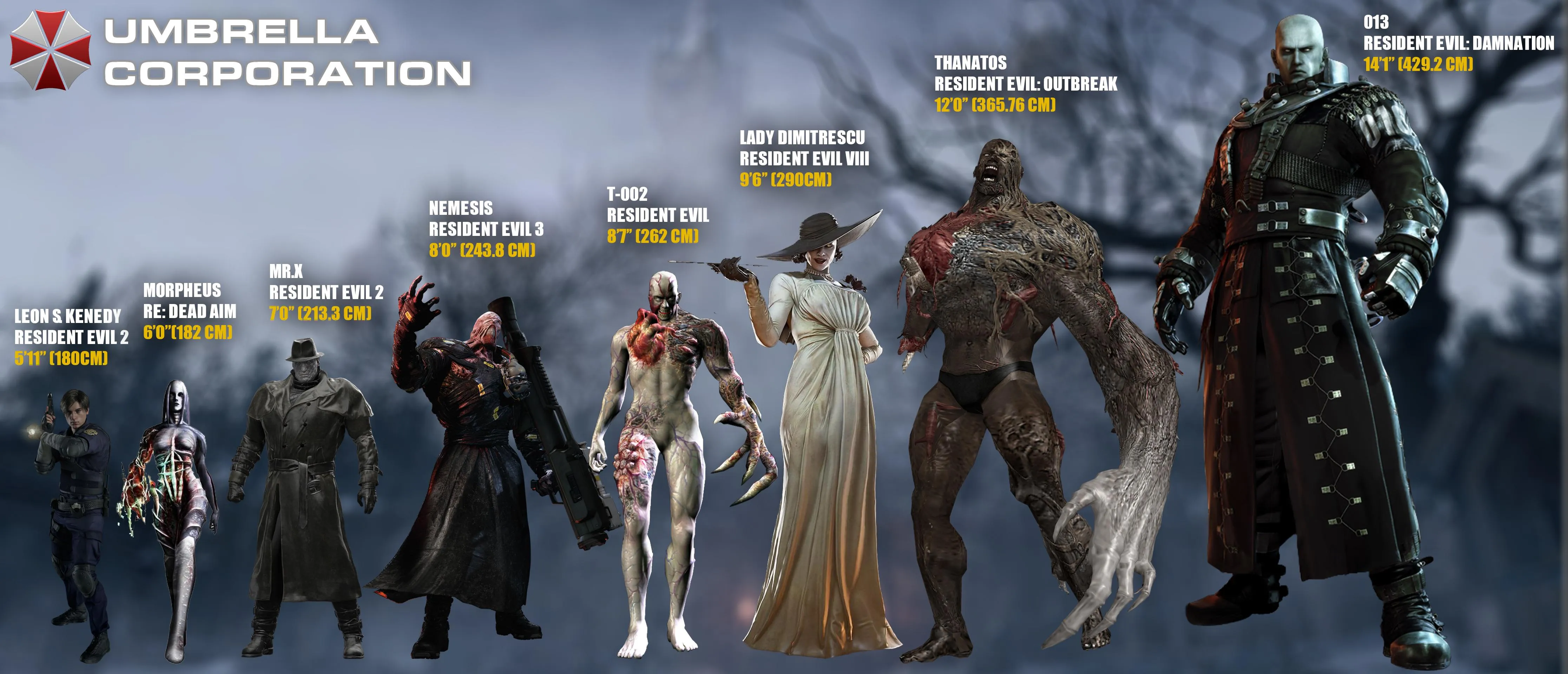 Користувач з нікнеймом 07PandorasBox вирішив поділитися на платформі Reddit цікавим постом. Йому стало нудно, тому він зробив топ найвищих персонажів із серії Resident Evil. Здається, розробники цих проєктів дуже полюбляють високих антагоністів. Очолив цей рейтинг Тиран Т-013 зі зростом у 429 сантиметрів, хоча Леон Кеннеді (протагоніст у деяких частинах) може похизуватися лише ростом у 180 сантиметрів. Випередив Леді й Танатос, хоча й всього на 75 сантиметрів.