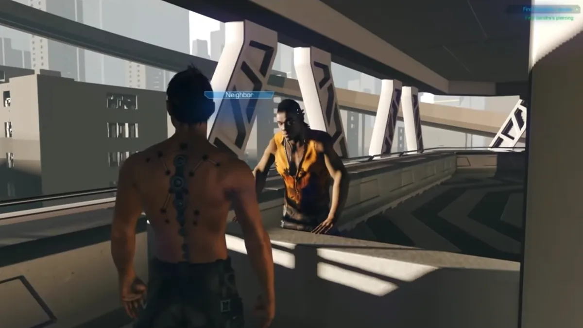 Коли Ві виходить на балкон, гравцеві надається можливість взаємодіяти з сусідом і запропонувати тому сигарету, після цього сусід ділиться з героєм інформацією про Сандру. Наприкінці відео дають можливість поглянути на дуже ранню версію Найт-сіті, де краєм ока можна помітити автомобілі, що літають вулицями.