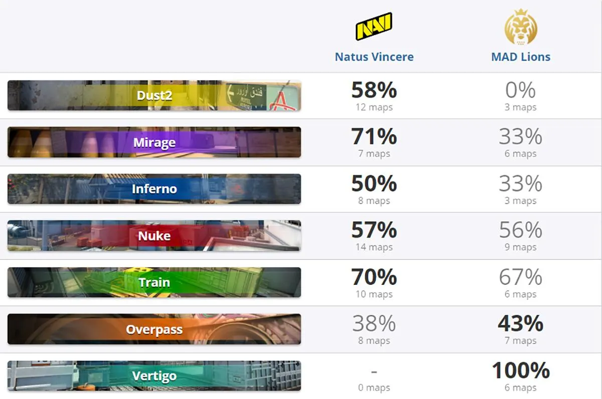 З цим колективом українська команда зустрічалася лише одного разу. У червні цього року Natus Vincere впевнено розібралася з MAD Lions (16:7 на Оверпасі та 16:5 на Міражі). За даними сайту HLTV, NAVI краще виступають майже на всіх ігрових мапах. Данці мають більший відсоток перемог лише на двох картах: Вертіго (NAVI взагалі не грають цю мапу) та Оверпас.