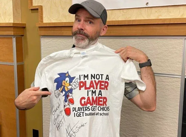 1 місце – "Голос" Соніка актор озвучки Роджер Крейг Сміт тримає футболку, яку фанат приніс на підпис
