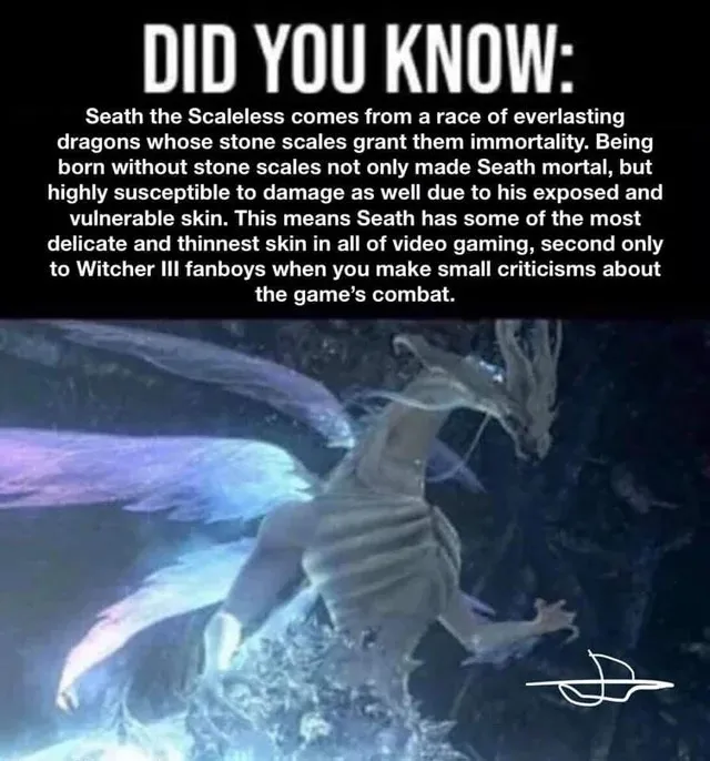 Чи знали ви: Seath the Scaleless походить з раси драконів, чия кам'яна луска гарантує їм безсмертя. Народження без кам'яної луски не тільки зробило Сета смертним, але й жахливо вразливим до пошкоджень через його надзвичайно тонку шкіру. Це означає, що Сет одне з найбільш делікатних та тонкошкірих створінь в усій історії геймінгу, програє він в цьому лише шанувальникам The Witcher III, коли ти озвучуєш найменшу критику про бойову систему їх улюбленої гри.