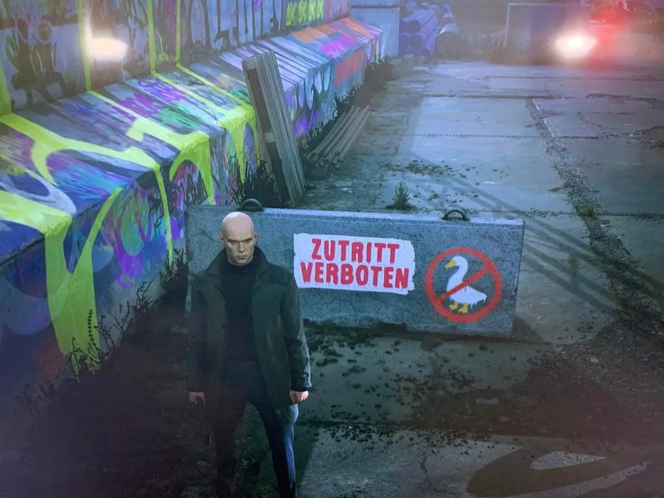 В одній із місій геймерів відправляють в околиці Берліну, саме там знаходяться нові цілі Агента 47. Але користувач з платформи reddit вирішив спочатку прогулятися цією місцевістю й не даремно. Геймер відшукав пасхалку на відому гру з назвою Untitled Goose Game. У цій відеогрі користувачі керують гусаком, який турбує всіх жителів свого селища. Гравець знайшов у Hitman 3 бетонні блоки зі знаком, на якому зображений гусак. Також там є напис німецькою мовою "Zutritt Verboten", а це можна перекласти так: "Прохід заборонено". Виходить, що гусакам краще не гуляти у цих місцях.