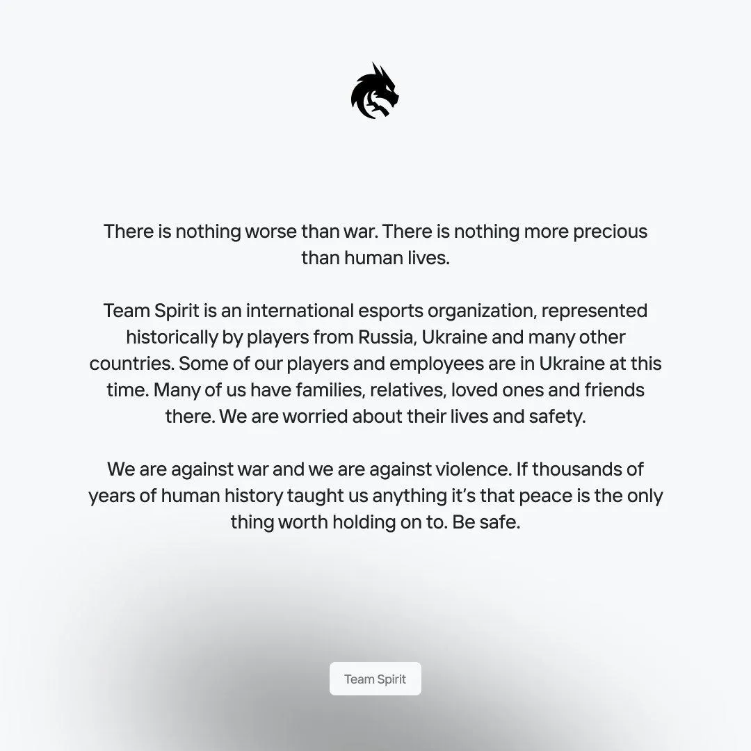 Щоправда, одразу ж після початку війни Team Spirit показала, що тепер росіянам потрібно шукати нову "Гордість". Річ у тім, що ще 24 лютого вона виступила проти війни, а в її офіційному твітері з'явився досить сміливий лист. Річ у тім, що Team Spirit не побоялася назвати події на території нашої країни словом "війна". А це досить таки нехарактерно для місцевих публічних осіб чи організації.