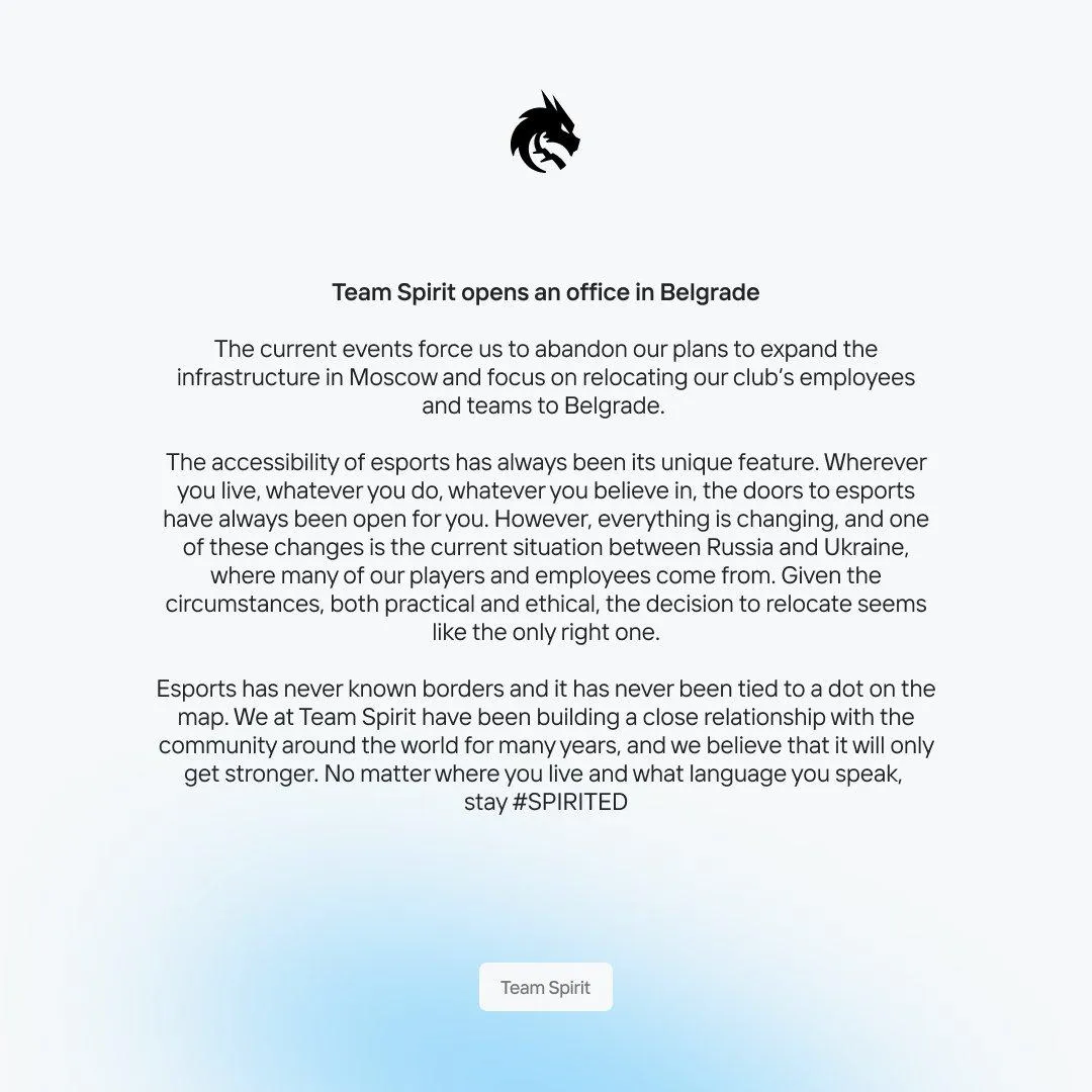 А нещодавно організація Team Spirit виступила з ще однією цікавою заявою. Річ у тім, що зараз вона займається переїздом в сербське місто Белград, а також не планує розширювати свою інфраструктуру в Москві. Згідно з офіційною інформацією, у Сербії ця організація планує відкрити новий офіс, а також перевести свій штат. Також вже відомо, що в Белград вона перевезла склади із CS:GO та Dota 2.