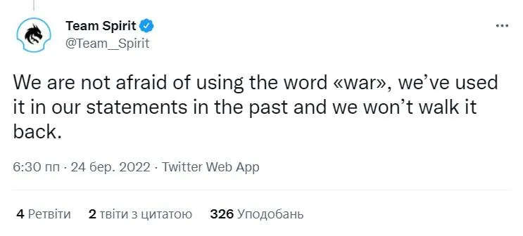 Відзначимо, що подібне повідомлення з'явився не лише у твітері, а й в деяких інших соцмережах організації. Дуже сподіваємося, що в майбутньому Team Spirit буде використовувати слово "війна" не лише в коментарях, а й у своїх офіційних заявах.
