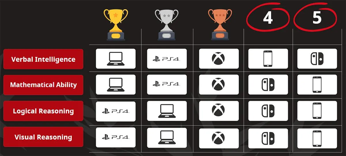 Дослідження було зосереджене на 4 ключових показниках: вербальному інтелекті, математичних здібностях, логічному мисленні та візуальному мисленні. Виявилося, що у PC-геймерів найбільший рівень IQ – 112,3. На другому місці розташувалися шанувальники консолі PlayStation (110,7), а на третій сходинці – фанати Xbox (103,8). На останніх місцях геймери, які полюбляють Switch (101,3) та смартфони (99,4).