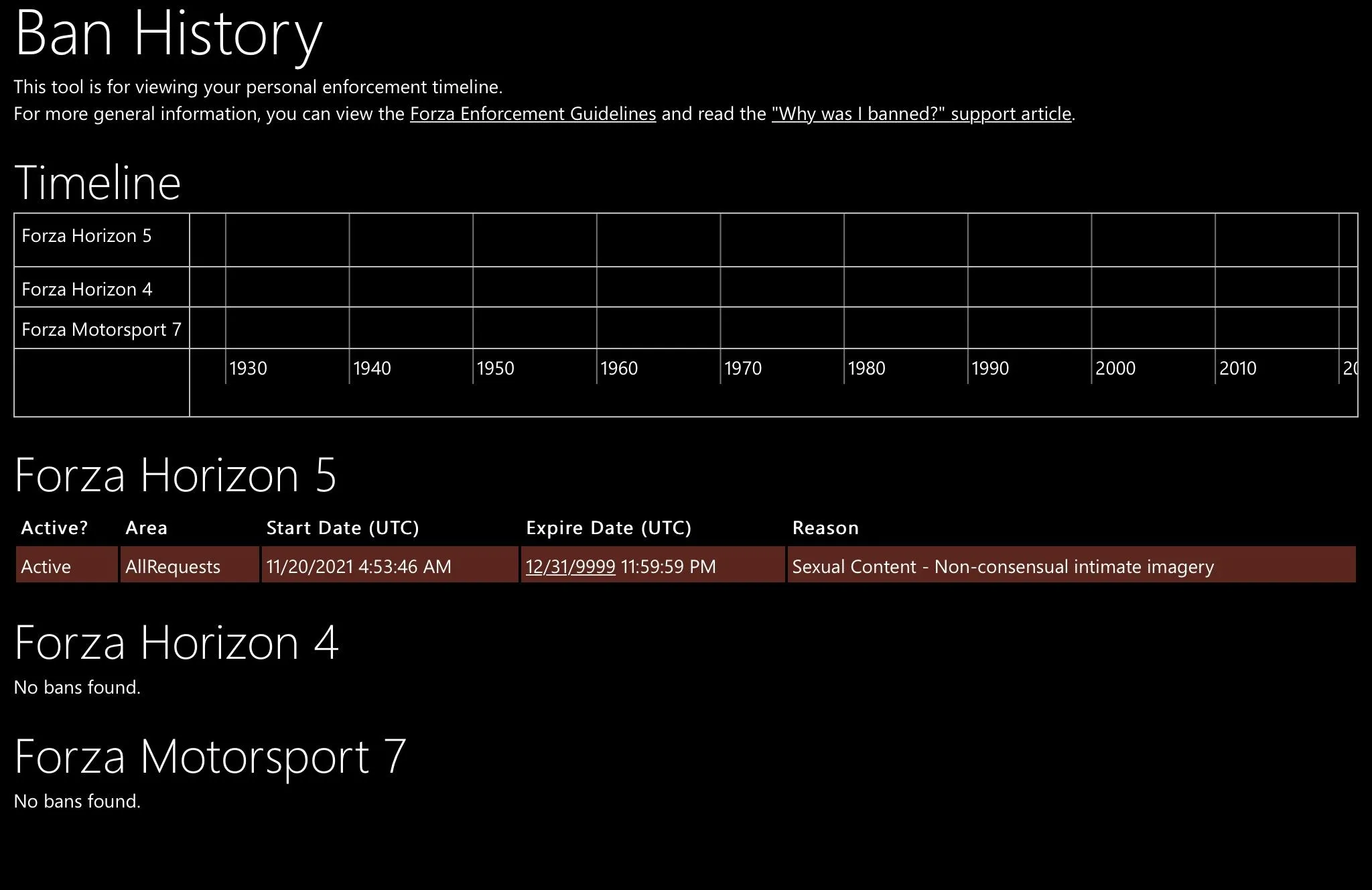 Самое интересное в этой ситуации то, что git-regret получил перманентный бан до 31 декабря 9999 года. Геймер отметил, что такое суровое наказание он получил без всякого предупреждения, или предварительной блокировки на 7 или 30 дней. Причиной указано использование "сексуального контента", правда, неизвестно, какой именно арт не понравился представителям Playground Games.