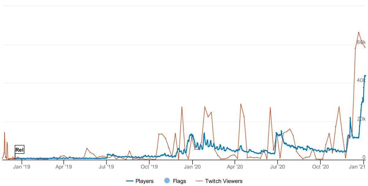 Статистика видеоигры Bloons TD 6 за все время: синий – онлайн в Steam, красный – онлайн на Twitch / фотография с портала SteamDB