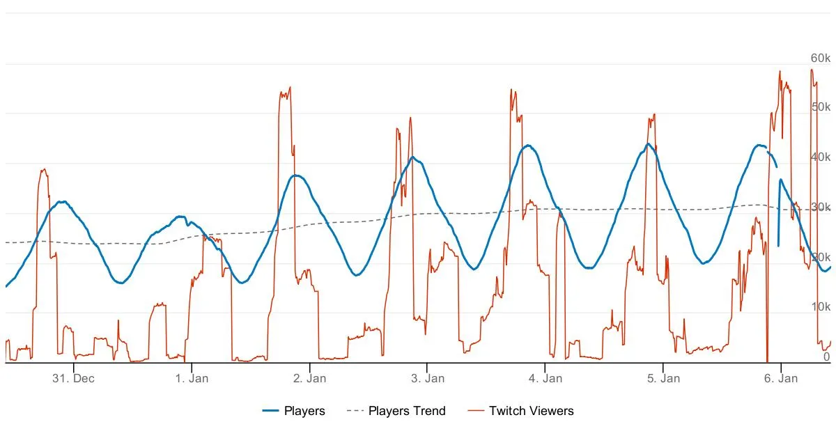 Статистика видеоигры Bloons TD 6 за последнюю неделю: синий – онлайн в Steam, красный – онлайн на Twitch / фотография с портала SteamDB