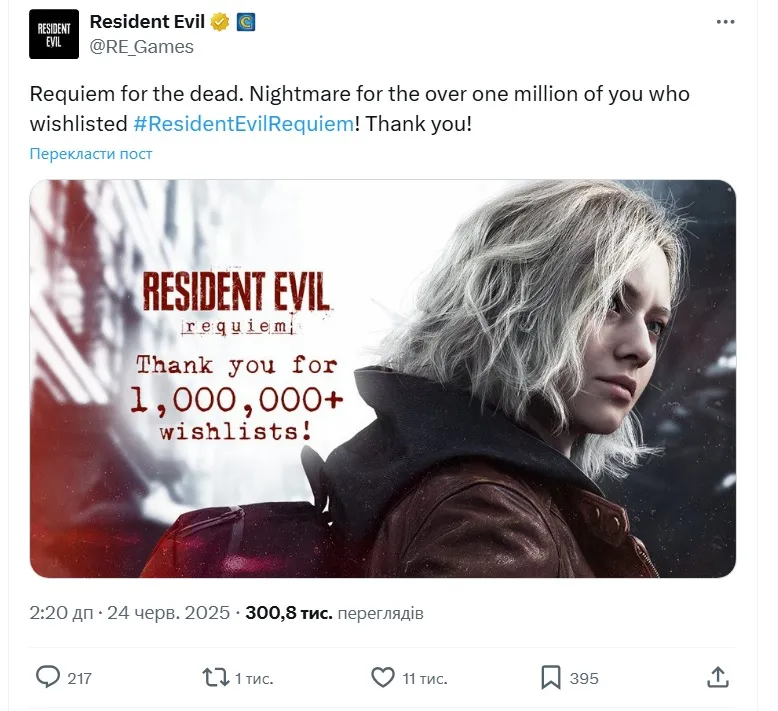 По данным официального микроблога франшизы, с момента анонса Resident Evil Requiem – девятой номерной части серии, представленной на SGF 2025 – более миллиона пользователей добавили игру в свои списки желаний, информирует 24 Канал.