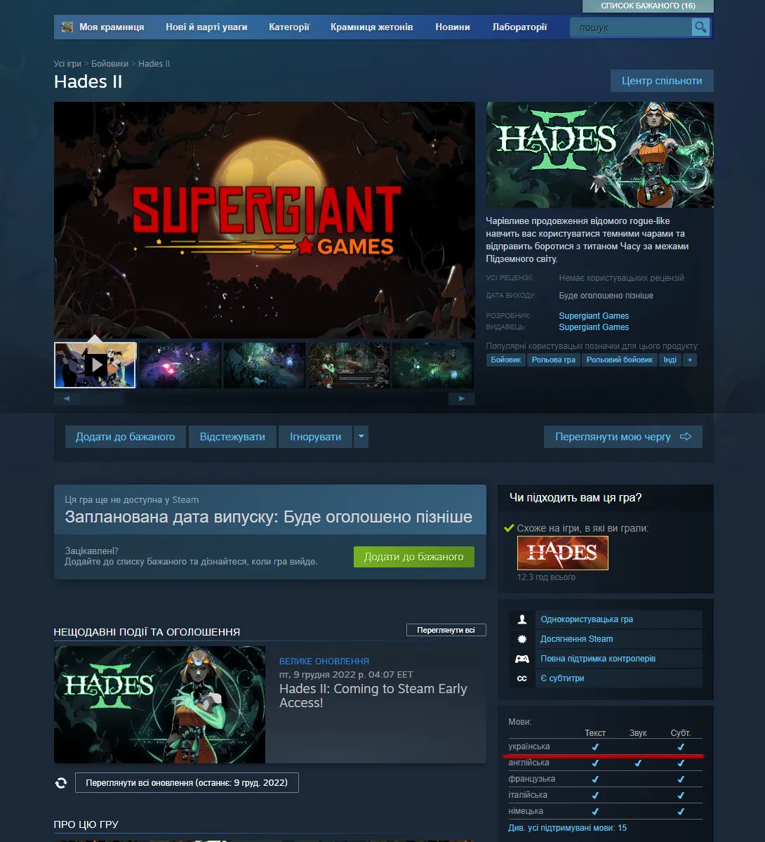 И вот теперь наличие украинской локализации в Hades 2 официально подтверждено, ведь информация об этом появилась на странице игры в Steam.