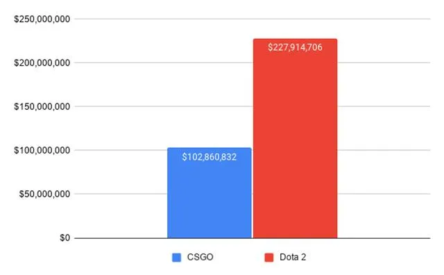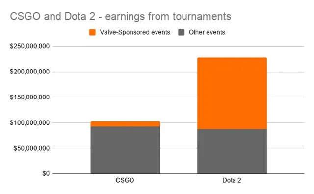Общая сумма всех призовых на турнирах с Dota 2 составила почти 228 миллионов долларов, а в соревнованиях по CS:GO – 102,8 миллиона долларов. Призовой фонд всех турниров с Dota 2 пока значительно превышает призовые, которые получают команды в CS:GO. Интересно также, что с Dota 2 за эти годы прошло 1444 турнира (почти 158 тысяч долларов на один турнир), а с CS:GO – 5278 турниров (19 тысяч долларов на один турнир).