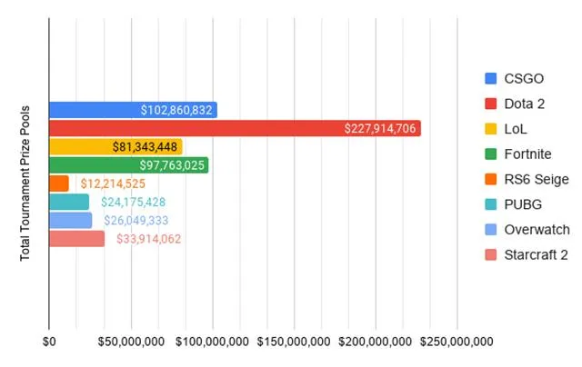 CS:GO и Dota 2 пока лидеры за суммарным призовым фондом. То есть, даже таких инвестиций от Valve в турниры по CS:GO хватает для удержания игры в топе. Также стоит отметить видеоигру Fortnite, в соревнования по которой вложили почти 98 миллионов долларов, хотя этот проект вышел только в 2017 году.