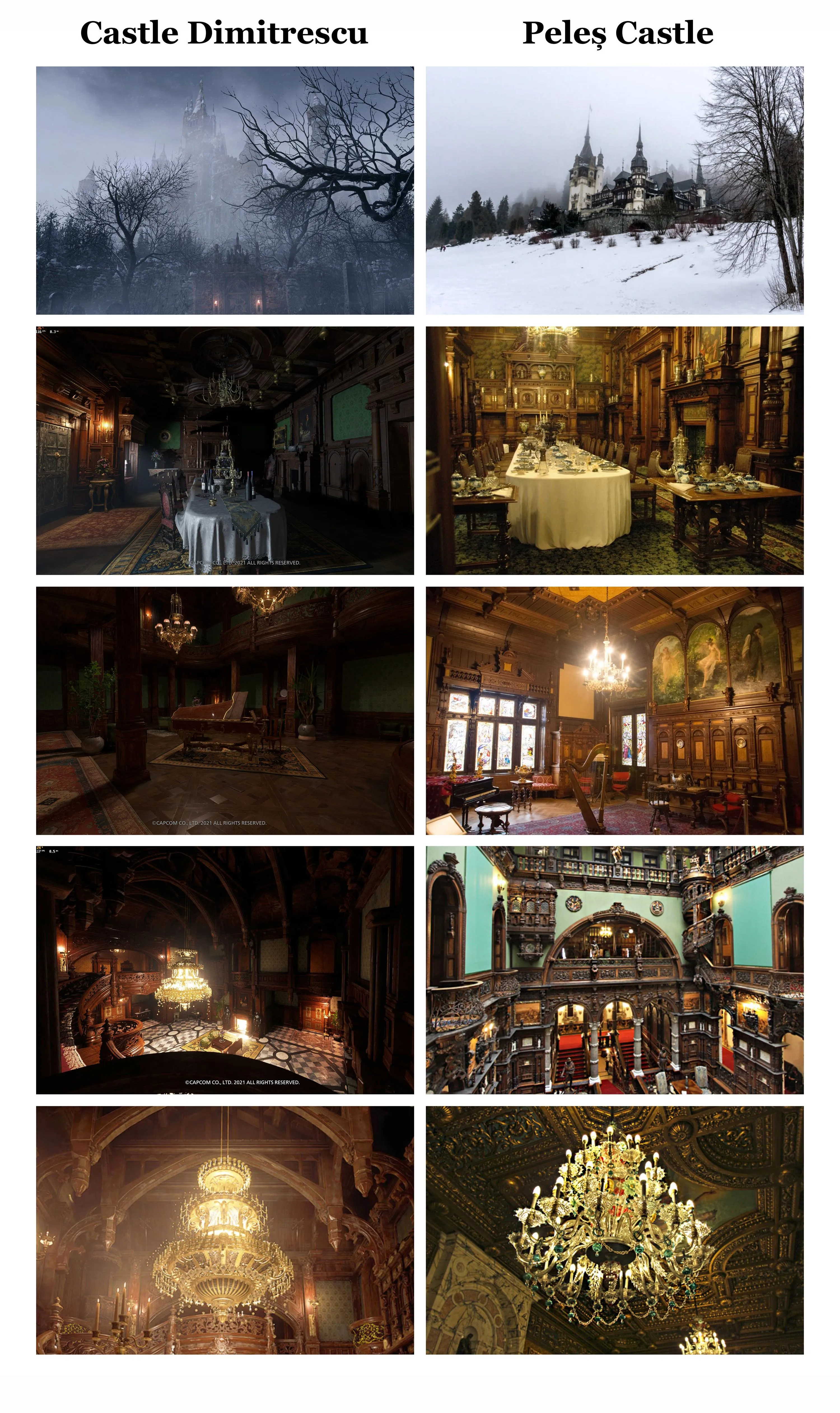 Пользователь Smooth_Skin_Operator сравнил фото замка Пелеш со скриншотами этого дворца из игры. Можно заметить, что разработчики из Capcom немного увеличили виртуальный вариант, добавили несколько башен со шпилями и сделали его более жутким (в готическом стиле). Помещения этого поместья также стали просторнее, но похожих элементов все равно немало. Например, использование зеленого цвета в интерьере обоих замков, почти одинаковые столовые или повторение дизайна люстр. Понятно, что полностью идентичными эти замки трудно назвать, но влияние реального сооружения бесспорно.