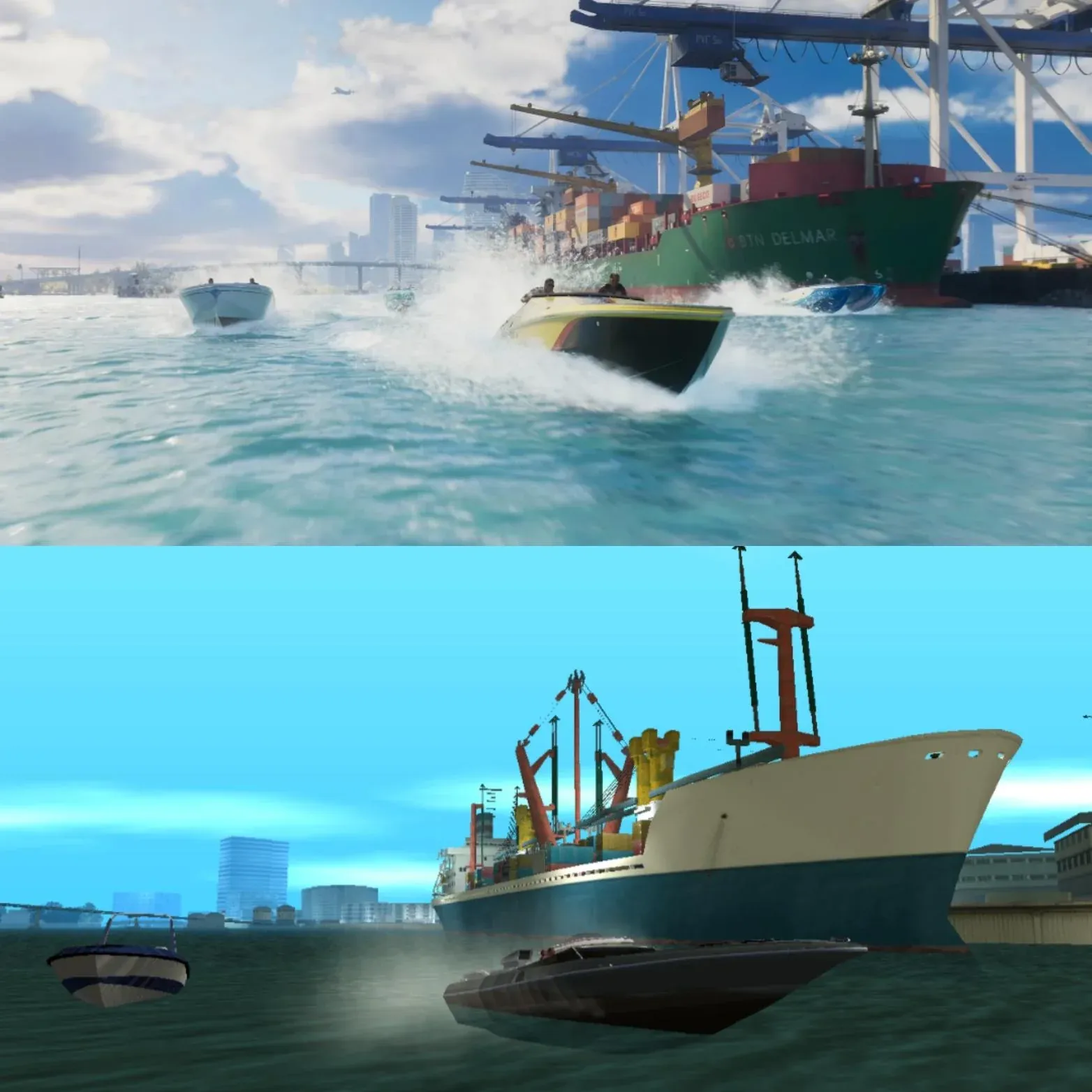На фотографиях видно, что игрок тщательно подбирал одинаковые локации, такие как Vice Beach, побережье с отелями или грузовой корабль, пришвартованный в гавани.