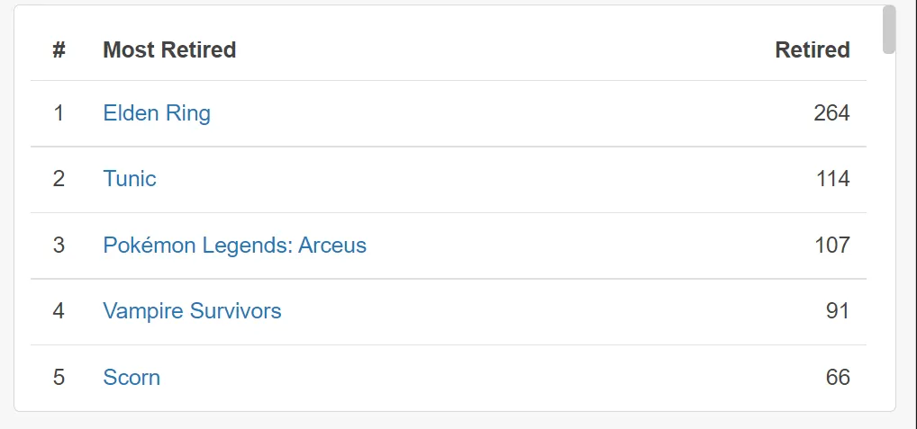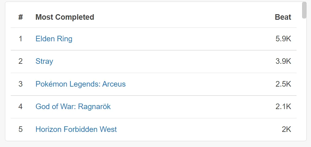 Согласно данным полученным порталом, Elden Ring стала игрой, которую сумели завершить почти 6 тысяч пользователей сайта. В этой гонке, масштабная RPG от FromSoftware опередила Stray, которую прошли до конца почти 4 тысяч пользователей.