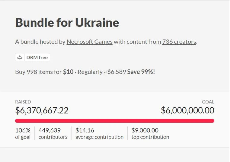 Согласно официальным данным, в среднем геймеры покупали такой набор примерно за 14 долларов. Также отметим, что наибольшее пожертвование составило 9 тысяч долларов. А в целом набор "Bundle for Ukraine" приобрело 450 тысяч пользователей. Вместе они смогли собрать впечатляющую сумму в почти 6,4 миллиона долларов.