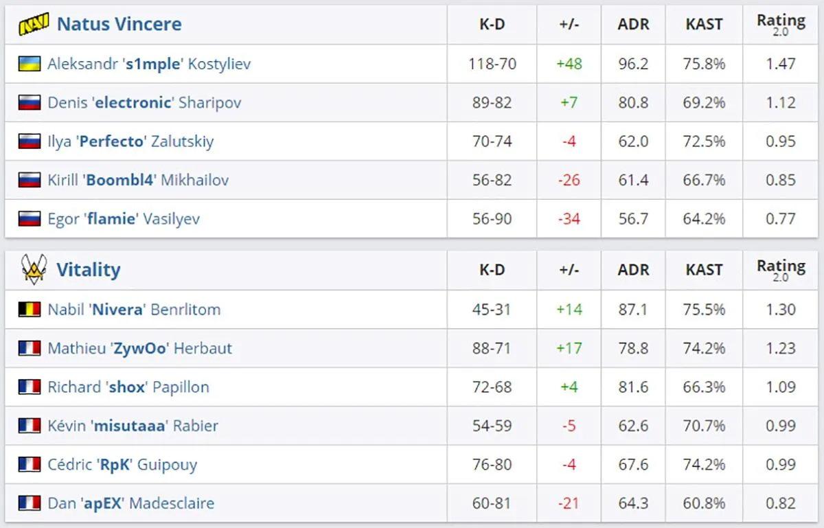 В команде Natus Vincere с прекрасной статистикой завершил матч s1mple (118 – 70, +48), а в Vitality выделялся ZywOo (88 – 71, +17), особенно на решающей карте. Также французы очень активно использовали 6 игрока: Nivera заменил misutaaa на Dust2, а shox на Inferno.