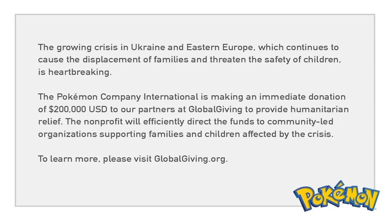 Разработчики из компании The Pokemon Company поддержали украинцев в это непростое время. Они написали, что то, что происходит в нашей стране и на ее границах – это ужасное зрелище. Именно поэтому представители этой известной компании пожертвовали 200 тысяч долларов организациям, которые помогают украинцам, пострадавшим от вероломного вторжения России.
