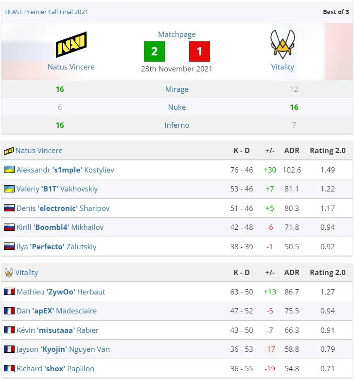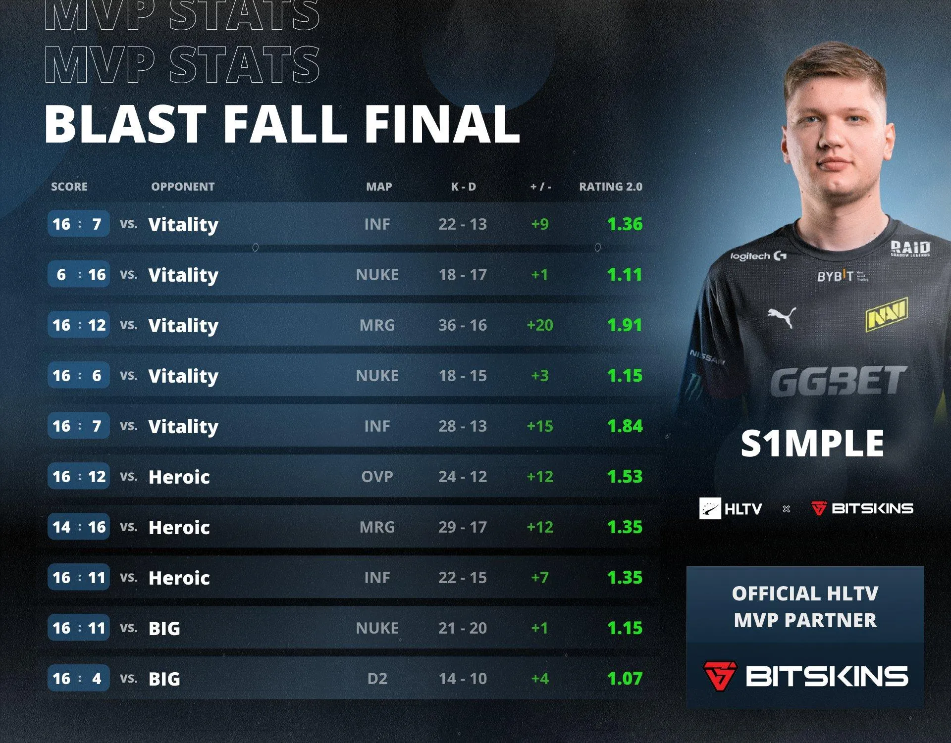 Лучшим игроком BLAST Premier: Fall Finals 2021 стал Александр "s1mple" Костылев, проведший очередной турнир на очень высоком уровне. Напоследок стоит отметить, что украинская организация Natus Vincere за победу в этом соревновании получила 225 тысяч долларов, а вот Team Vitality – 85 тысяч долларов.