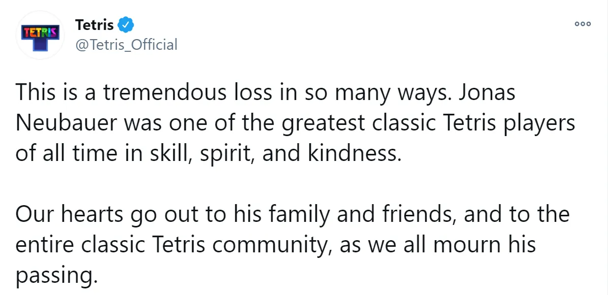 Йонас Ньюбауер був одним з найкращих гравців класичного тетрісу всіх часів у майстерності, дусі та доброті, – сказано в повідомленні.