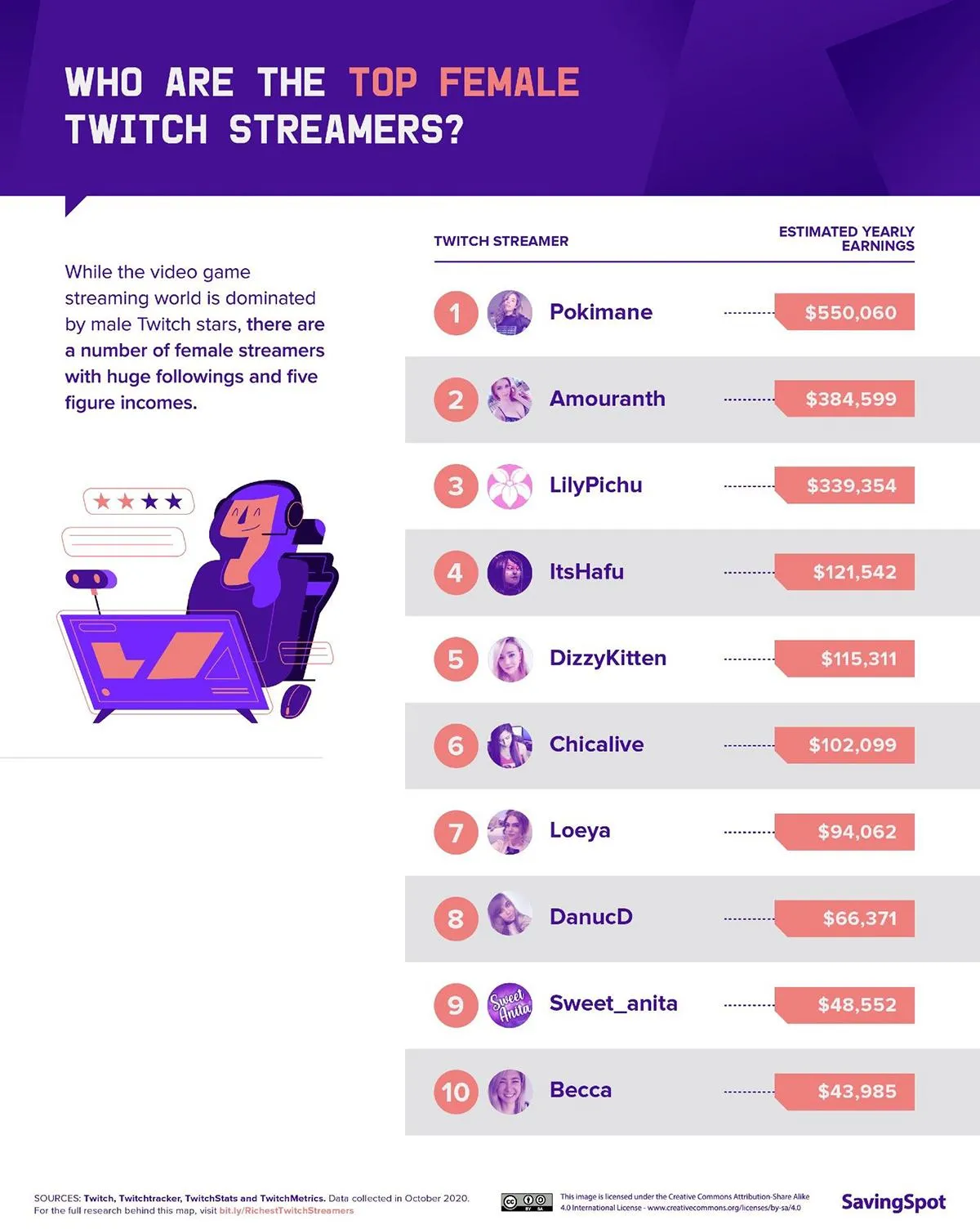 У жіночому рейтингу впевнено лідирує Іман "Pokimane" Аніс, яка відома обмеженням максимальної суми для донату на своїх стрімах (не більше 5 доларів). Кетлін "Amouranth" Сірагуза лише друга, хоча вона постійно у центрі різноманітних скандалів. Її акаунт вже блокували навіть за демонстрацію статевих органів. Третя у цьому топі Лілі "LilyPichu" Кі, яка зазвичай грає у League of Legends та Valorant. Жінки на платформі Twitch отримують свої прибутки від:
