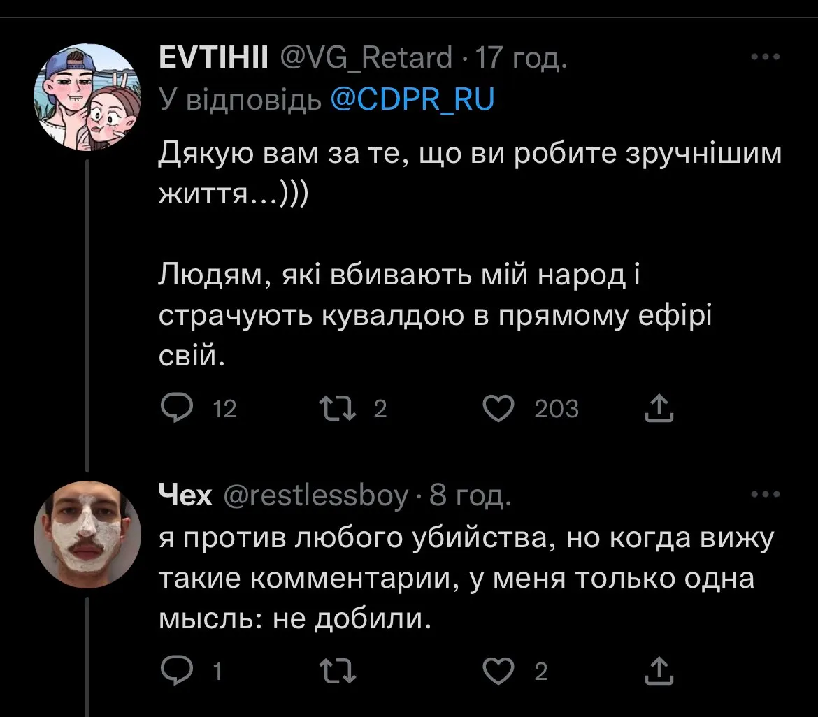 У коментарях до посту, серед повідомлень розчарованих українців, знайшлося безліч росіян, які не приховують насолоди від вчинку CDPR. Особливо "відбиті" екземпляри навіть заявляють, що за подібну негативну реакцію українців не шкода й вбити.